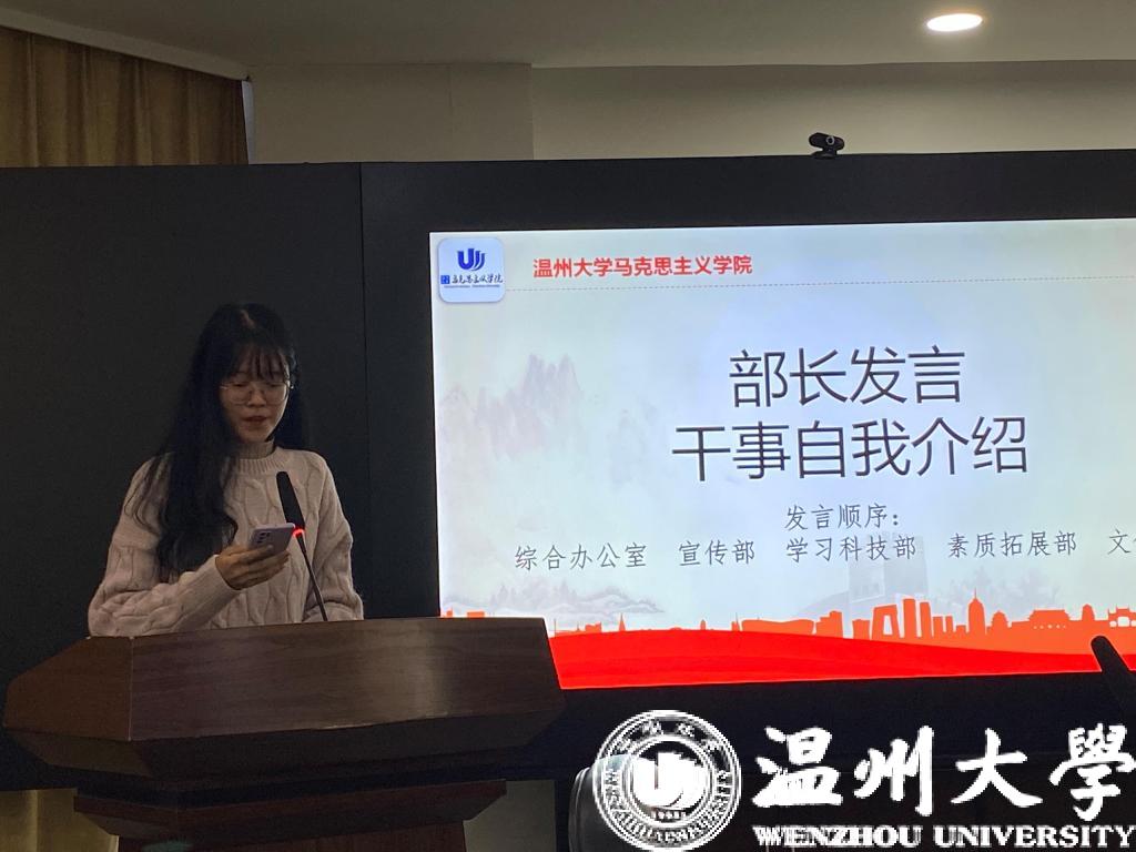 接着,由团委·学生会执行主席陈嘉滢发言。她总结了近期团学的工作并对接下来工作的提出了要求。陈嘉滢主席表示,作为学生会中的一员,我们必须从各个方面严格要求自己,肩负高度的责任感和奉献精神,认真且及时完成各项工作,锻炼自己、提升自己以期在工作上日臻完善。