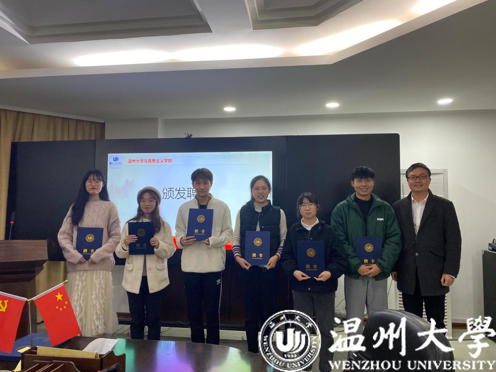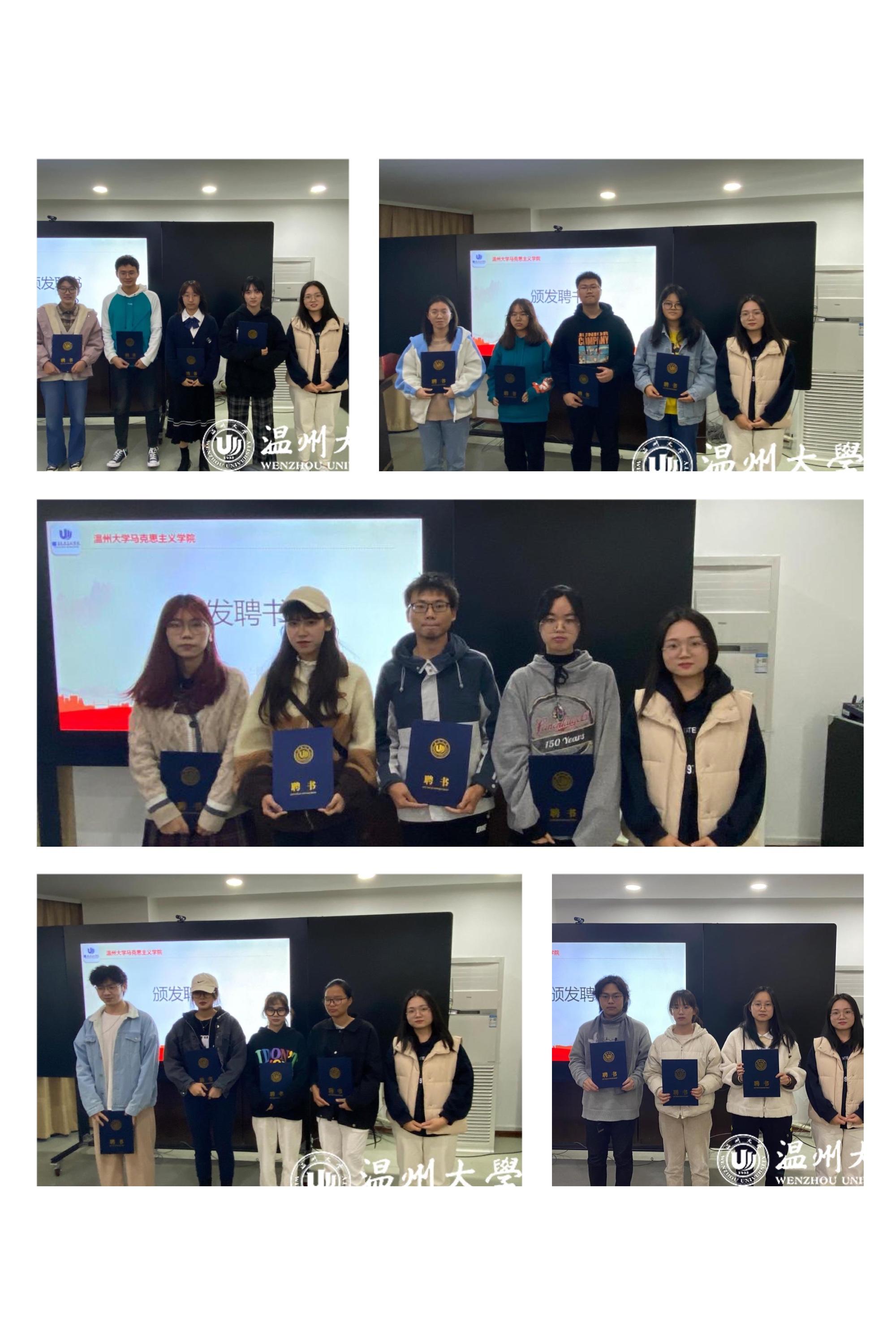 十大体育博彩排行榜 党委副书记叶柏霜、学工办林大可老师和魏梦瑶老师为新一届团学成员颁发了聘书并合影留念。