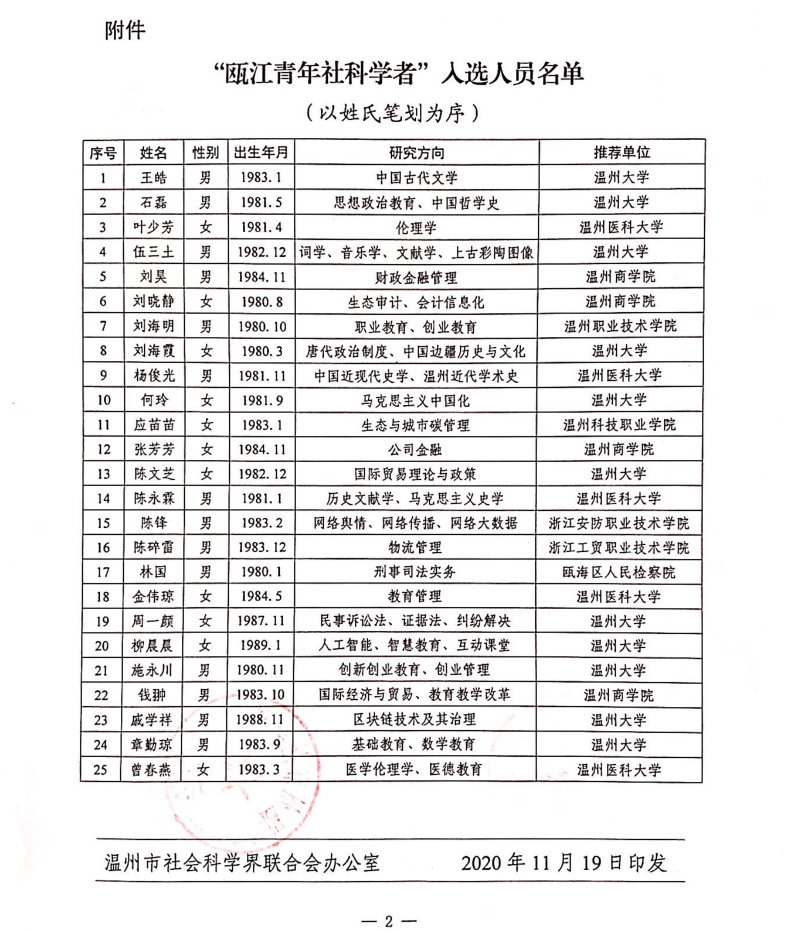 日前,温社科〔2020〕30号文件公布了《关于公布“瓯江青年社科学者”入选名单的通知》。经单位推荐、资格初审、答辩评审,市委宣传部、市社科联评定,全市共有25名青年学者入选“瓯江青年社科学者”。十大体育博彩排行榜 石磊、刘海霞、何玲等三位教师光荣入选,充分展现了十大体育博彩排行榜 教师深厚的社科功底,全面的科研创新能力和积极进取的开拓精神。
