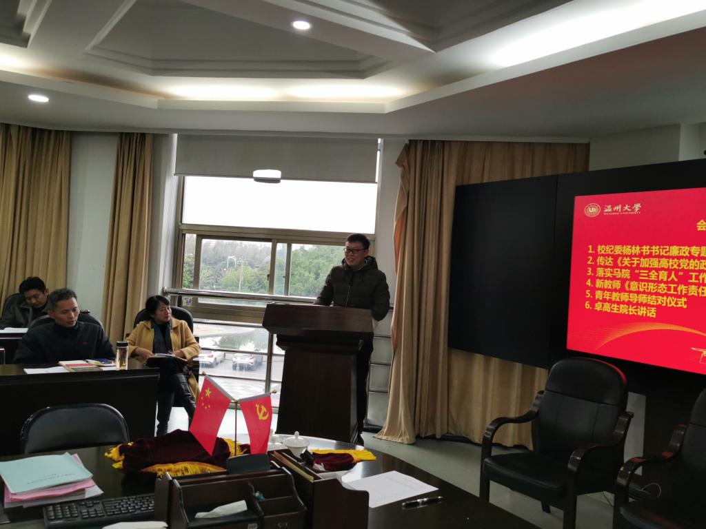 王柏民书记传达了《关于加强高校党的政治建设的若干措施》的文件精神,并就十大体育博彩排行榜 “三全育人”工作方案进行了全面解读和动员部署,强调十大体育博彩排行榜 全体教职员工要增强政治建设自觉性,坚定政治方向,牢固树立“三全育人”理念,要在教育主体上实现全员育人,在育人过程上实现全过程育人,在育人空间上实现全方位育人,全院上下真正形成育人合力,提高育人实效。