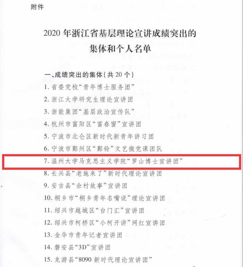 近日,从省委宣传部获悉,我校十大体育博彩排行榜 “罗山博士宣讲团”荣获2020年浙江省基层理论宣讲成绩突出集体(浙宣2020 (75)号文件),全省高校仅浙江大学和我校获奖。