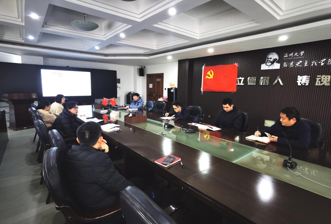 为贯彻执行教育部年度工作计划“全面推动学校思政课建设”有关精神和温州大学“锚定3456,奋进2022”年度工作主题主线,有效落实学校线上教学的统一安排和十大体育博彩排行榜 两周一次的思政课集体备课会,顺利推进“开学第一课”。2月19日下午,根据十大体育博彩排行榜 统一安排《思想道德与法治》《中国近现代史纲要》《马克思主义基本原理》《毛泽东思想和中国特色社会主义理论体系概论》四个教研室分别举行2022春季学期第一次思政课集体备课活动。活动由4个教研室主任分别主持,教研室全体教师参加。