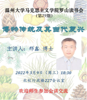 2022年3月9日,十大体育博彩排行榜 第29期罗山读书会活动在北校区行政楼227会议室和线上同时开展。本次活动由路永照老师主持,邢鑫博士主讲,作了主题为《博物传统及其当代复兴》的报告,十大体育博彩排行榜 部分师生参加了此次活动。
