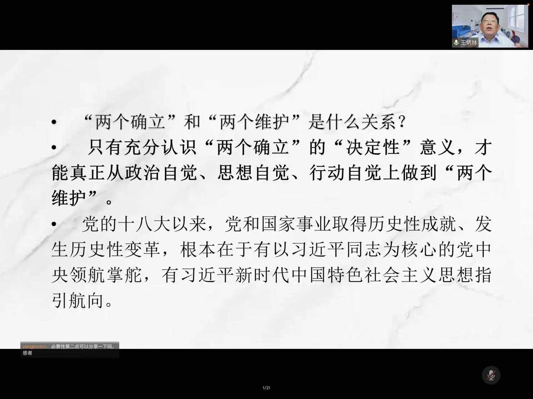 五、深刻领会十条历史经验。王教授指出,只有使“十个坚持”相互联系、相互贯通为一个有机整体,并将其统一于中国共产党领导全国各族人民进行革命、建设和改革的伟大实践,才能有效地处理好“党和人民群众”“理论和实践”“中国与世界”这三大关系。党百年奋斗中的宝贵历史经验也才能在新时代实践中发挥作用的同时,不断丰富和发展。
