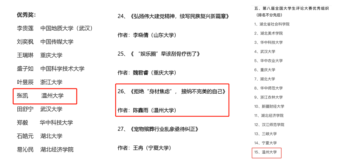 张凯同学突出重围 获得第八届全国大学生评论大赛优秀奖,陈鑫雨同学获得第八届全国大学生评论大赛优秀作品奖,我校荣获第八届全国大学生评论大赛优秀组织奖。