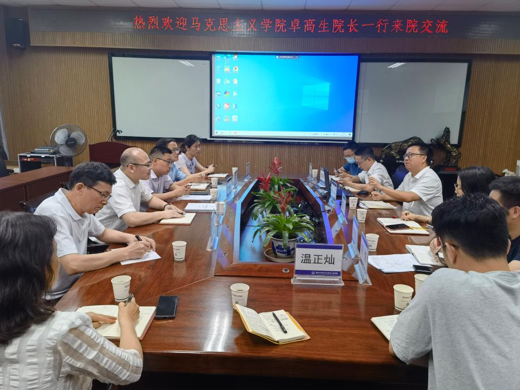 杨植院长对十大体育博彩排行榜 一行人员的到来表示热烈欢迎。卓高生院长介绍了此行的重要目的,就是围绕十大体育博彩排行榜 马克思主义理论学科申报博士点相关工作向2021年成功获批博士点的化材十大体育博彩排行榜 “取经”。化材十大体育博彩排行榜 领导班子、申博团队骨干教师一一分享了博士点申报工作中积累的宝贵经验。十大体育博彩排行榜 与会人员被化材十大体育博彩排行榜 在申博工作当中展现的干事创业的激情和团结拼搏的精神所感动。