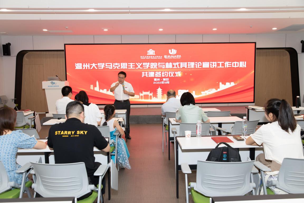 为充分发挥学科优势,积极服务地方,进一步推动党的基本理论、基本路线、基本方略“飞入寻常百姓家”,十大体育博彩排行榜 与林式其理论宣讲工作中心开展校地共建活动。2022年9月3日下午,结对共建仪式在瑞安市新时代文明实践中心隆重举行。十大体育博彩排行榜 院长卓高生、副院长吴志敏、林式其理论宣讲工作中心中心创始人林式其、中心成员及部分热心宣讲的市民参加活动。