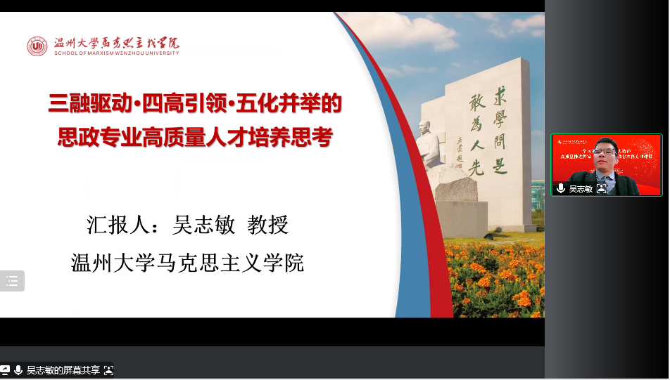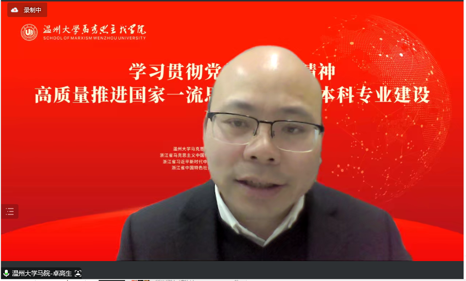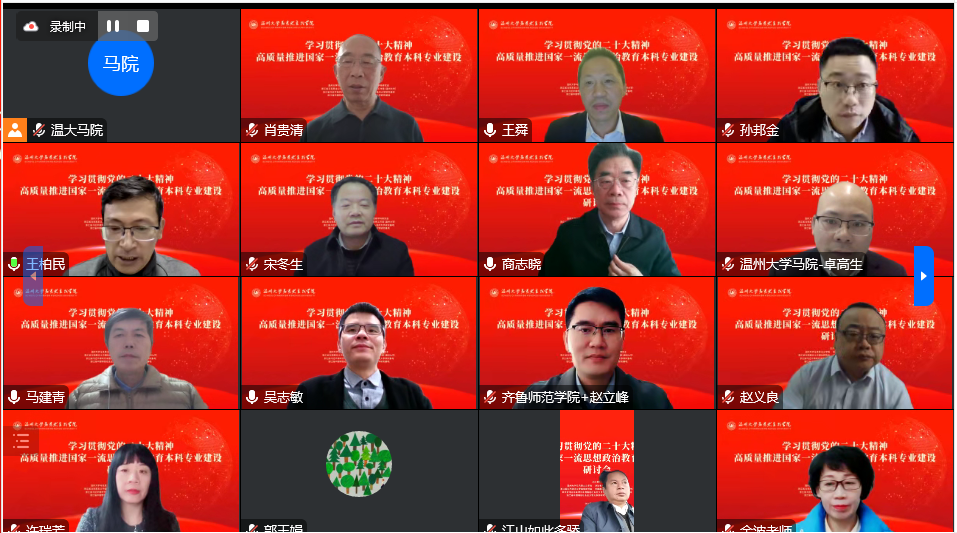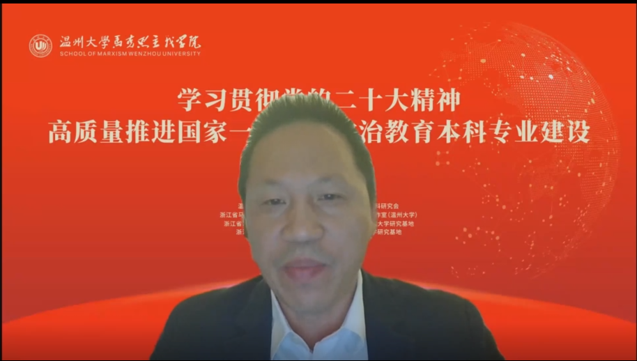 为了深入学习贯彻党的二十大精神,积极推进高质量国家一流思想政治教育本科专业建设,12月3日,由十大体育博彩排行榜 、浙江省思想政治教育学科研究会、浙江省马克思主义中国化研究会、全国高校思政课名师工作室(温州大学)等联合主办的“学习贯彻党的二十大精神暨高质量推进国家一流思想政治教育本科专业建设”研讨会顺利召开。