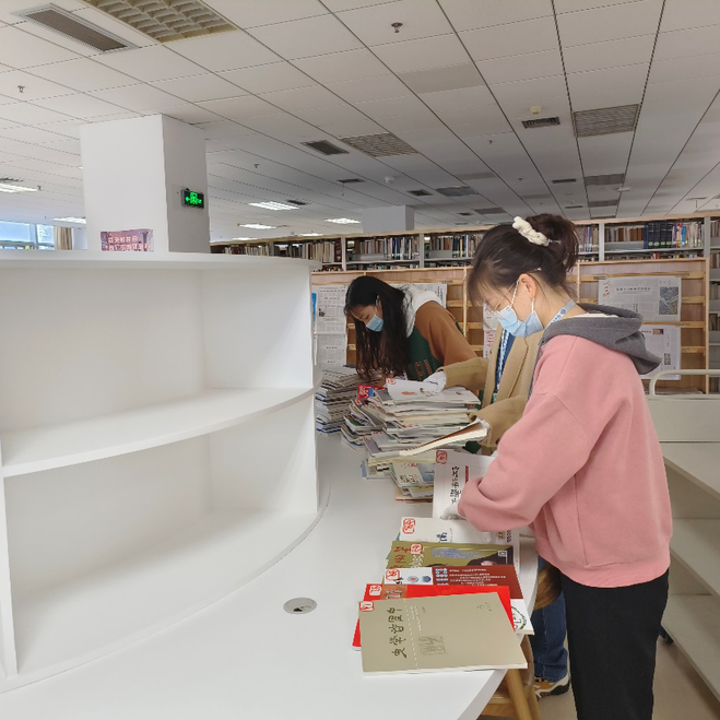 22马理论(学硕)团支部,于温州大学北校区逸夫图书馆开展了图书整理志愿服务活动。在图书馆工作人员的指导下,志愿者们分组协作下架往期图书,上架最新图书,并对积灰书架进行清洁。经过大家的努力,书柜的图书变得井然有序,类别一目了然,同系列、多卷册、 同类型的图书规整到位,为以后读者借阅提供了便利。