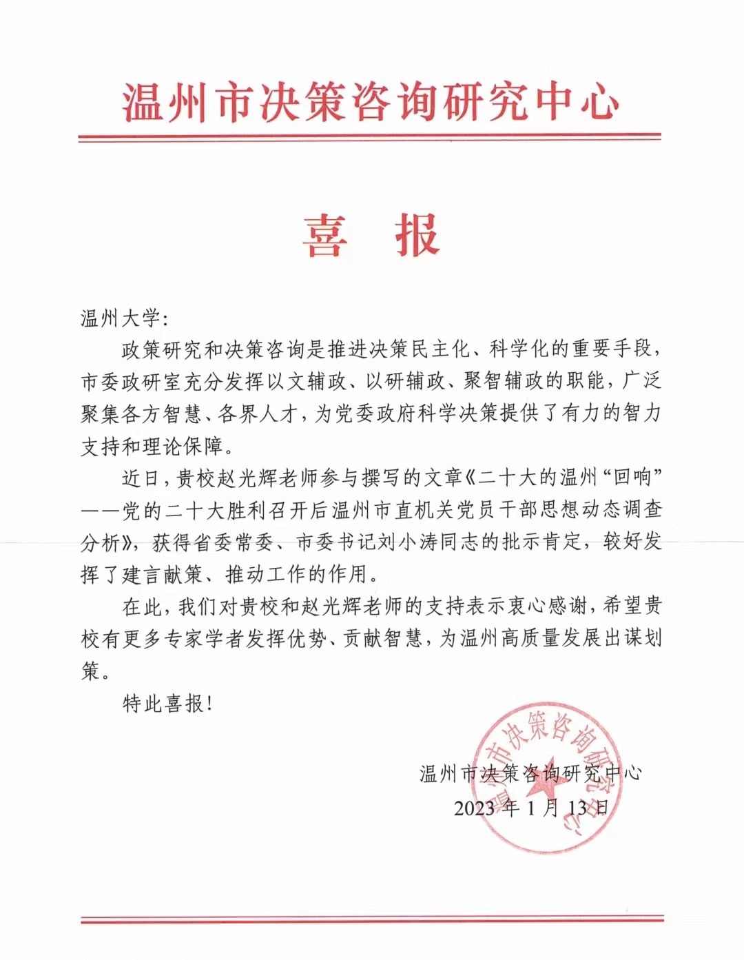 在党的二十大召开之际,由十大体育博彩排行榜 卓高生院长领衔、赵光辉老师撰写、张海波和安保国老师参与调研完成的调研报告《二十大的温州“回响”——党的二十大胜利召开后温州市直机关党员干部思想动态调查分析》获得省委常委、市委书记刘小涛同志的批示肯定。
