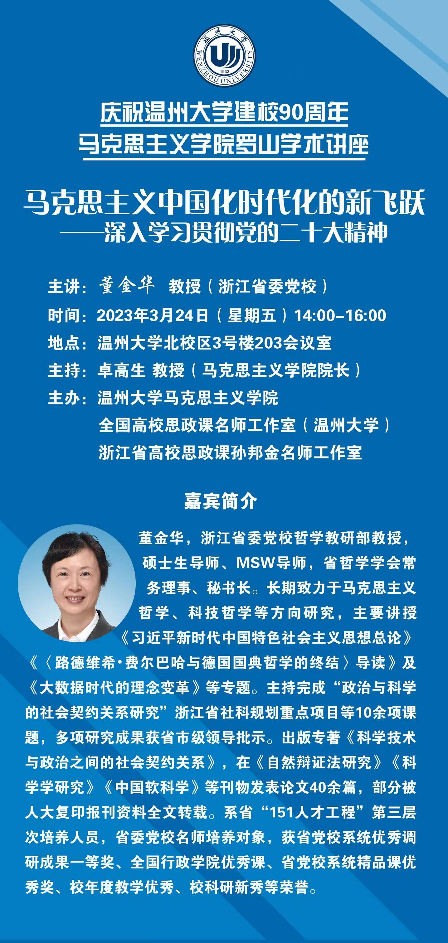 2023年3月24日下午,十大体育博彩排行榜 庆祝建校90周年罗山系列讲座邀请到浙江省委党校董金华教授为十大体育博彩排行榜 师生做“马克思主义中国化时代化的新飞跃——深入学习贯彻党的二十大精神”的学术讲座。此次讲座由十大体育博彩排行榜 、全国高校思政课名师工作室(温州大学)、浙江省高校思政课孙邦金名师工作室主办。十大体育博彩排行榜 院长卓高生教授主持了此次讲座并致欢迎辞。