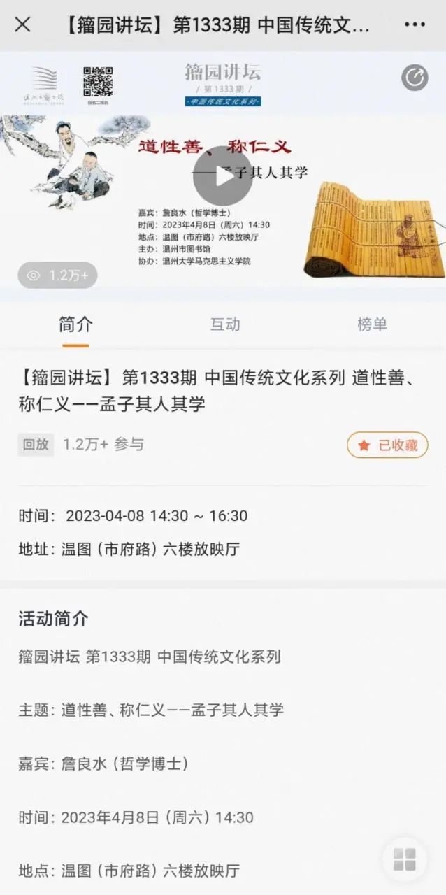 本次讲座,通过詹良水老师的分享,激发了听众对孟子、对经典的阅读兴趣,也使读者对孟子及其思想有了更深入的了解。詹老师的讲授,逻辑清晰,深入浅出,内容充实,受到读者的热烈欢迎,线上参与人数达1.2万人次。