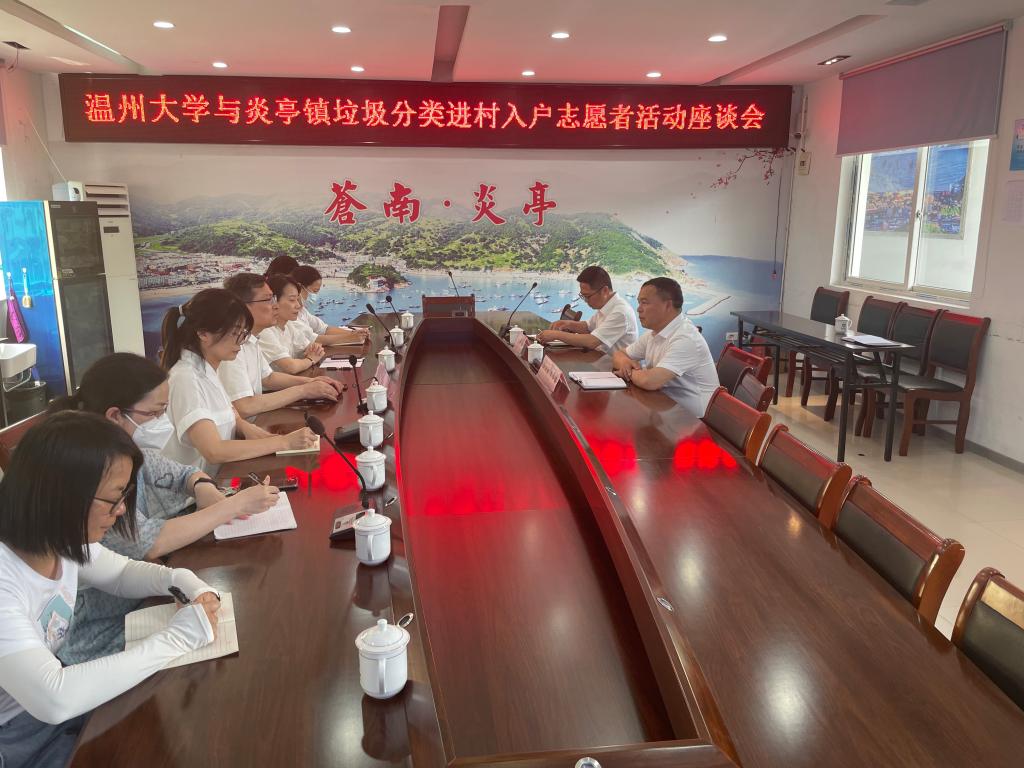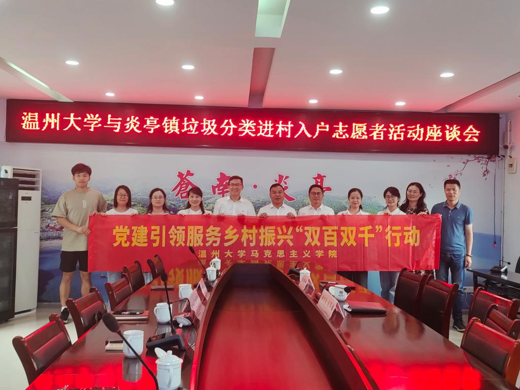 为响应校党委关于党建引领服务乡村振兴“双百双千”工作要求,发挥高校在促进乡村连片提升示范区工作中的作用,6月2日,十大体育博彩排行榜 行政党支部在十大体育博彩排行榜 党委书记王柏民、党委副书记叶柏霜的带领下,赴苍南县炎亭镇党委对接党建引领服务乡村振兴“双百双千”工作。苍南县炎亭镇党委书记侯百前、党委副书记王瑞祥、副镇长周鑫等接见了行政党支部一行人员,炎亭镇城管中心负责人易志安同志陪同接见。