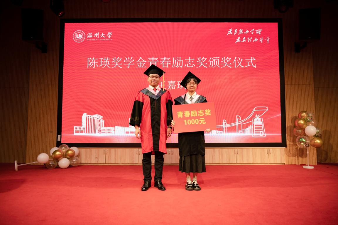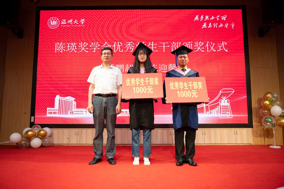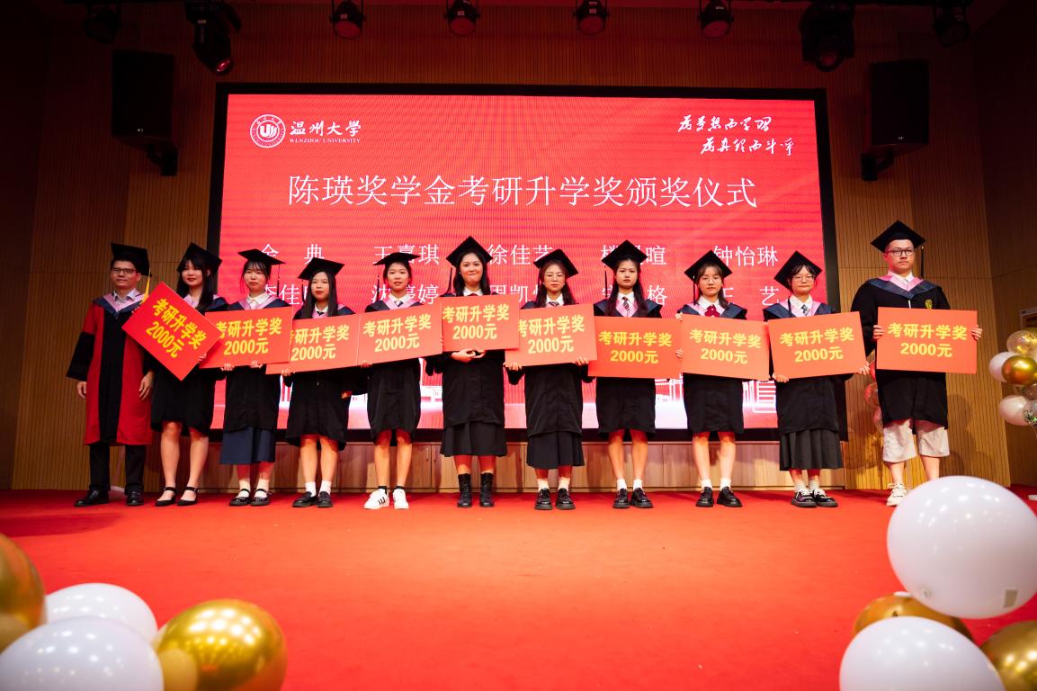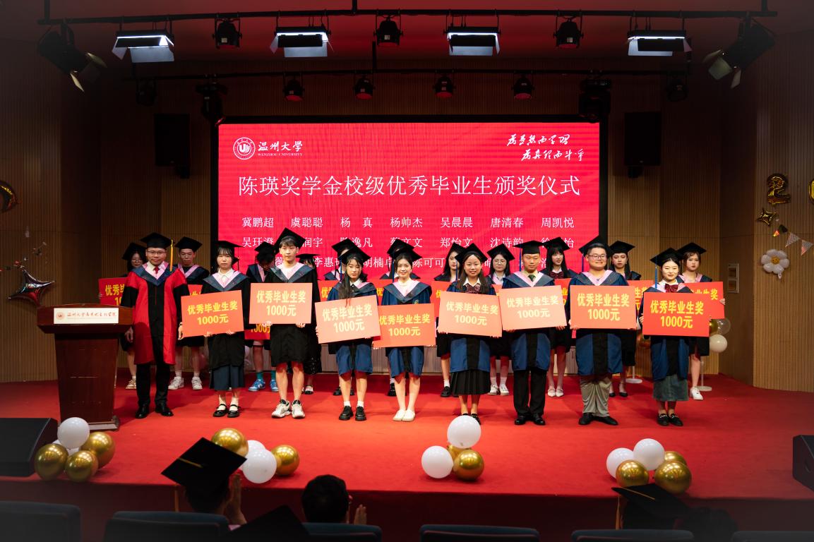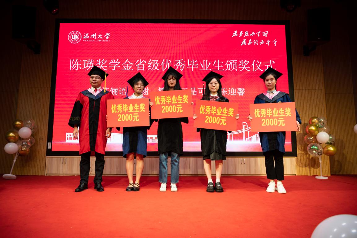 毕业典礼还进行了陈瑛奖学金颁奖仪式。陈瑛校友是温州大学(原温师院)89届思政专业毕业生,他热心社会公益事业,多次捐赠、募集资金帮助家乡及四川、贵州、云南等地的学校建设和贫困师生。陈瑛校友对母校怀有深厚的感情,他慷慨解囊,为体育博彩学子设立陈瑛奖学金,支持和鼓励同学们不断努力追求卓越,积极奉献社会。此次陈瑛奖学金设立考研(考博)升学奖、学科竞赛奖、优秀毕业生奖、优秀学生干部奖和青春励志奖,由党委书记王柏民老师、院长卓高生老师、副院长孙邦金老师、副院长吴志敏老师为获奖学生颁奖。