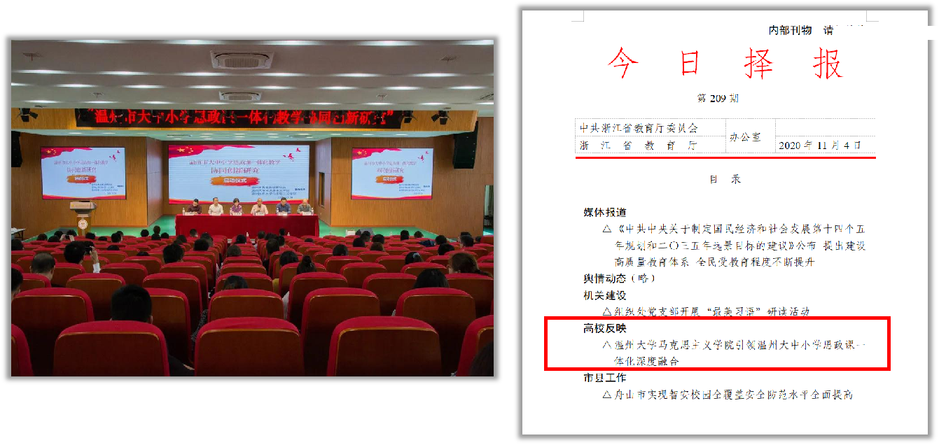 近日,《浙江教育报》刊发文章《聚焦“关键题” 探索“新格局” 温州大学下好大中小学思政课一体化“一盘棋”》,报道我校始终坚持立德树人根本任务,多维并举推进大中小学思政课一体化建设。全文如下:
