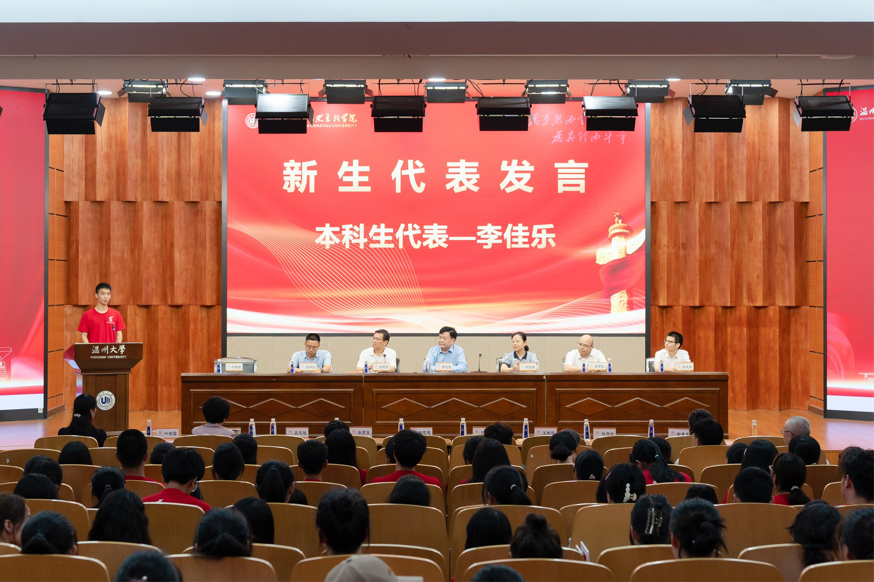 十大体育博彩排行榜 85届优秀校友、上海集强产业园区董事长谢忠旭先生,温州大学研究生院院长刘玉侠,十大体育博彩排行榜 党委书记王柏民、院长卓高生、副院长孙邦金、吴志敏出席,十大体育博彩排行榜 各系室主任(副主任)、导师代表、新生班主任、辅导员老师、学生代表以及2023级全体新生参加,典礼由党委副书记叶柏霜主持。
