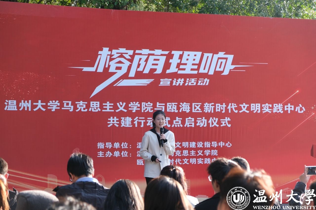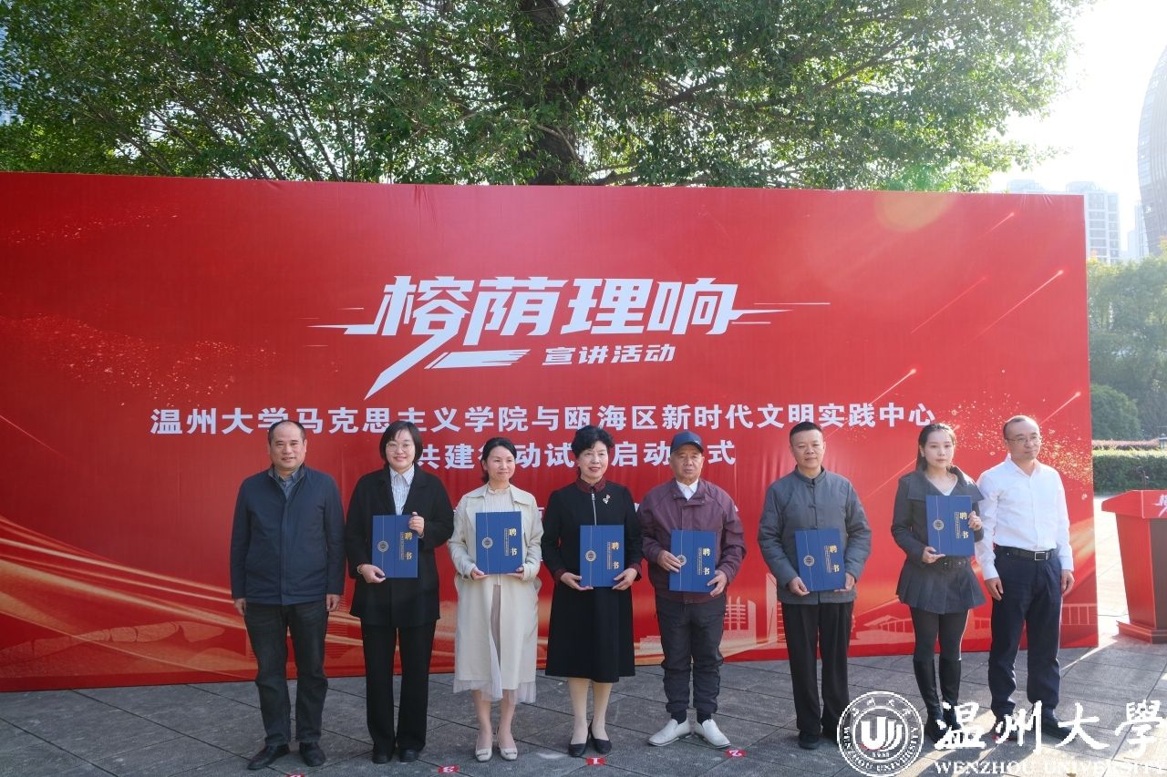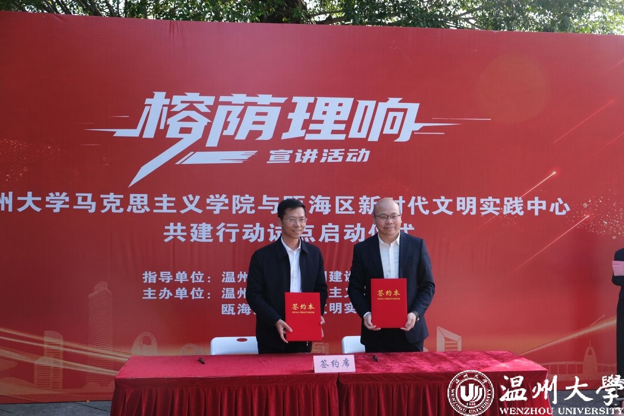 当天活动还举行十大体育博彩排行榜 和瓯海区新时代文明实践中心共建行动试点启动仪式,“十大体育博彩排行榜 和瓯海新时代文明实践中心共建基地”揭牌,签署《共建行动战略合作协议》,为瓯海区新时代文明实践宣讲团、温州大学新时代文明实践博士宣讲团颁发聘书等。