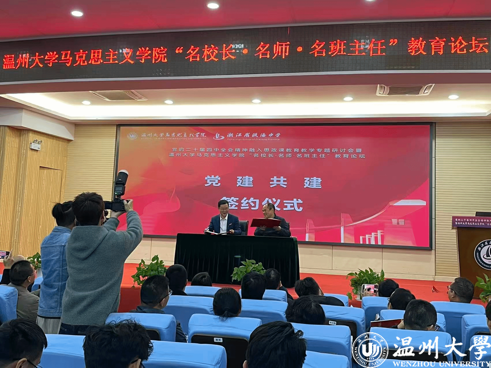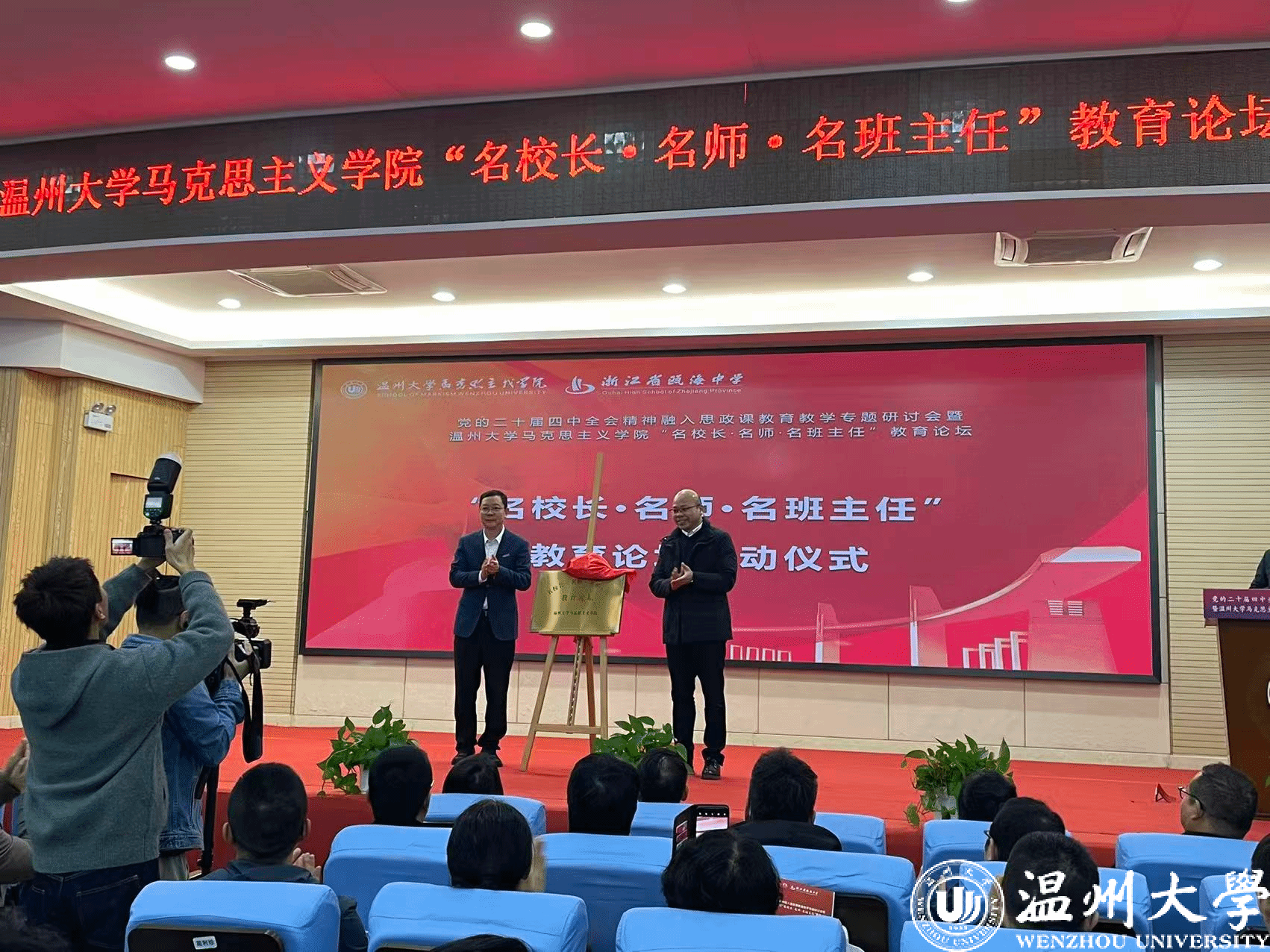 现场,还举行了温大体育博彩“名校长·名师·名班主任”教育论坛揭牌仪式,以及温大体育博彩党委与瓯海中学党委的党建共建合作签约仪式,双方将以高质量党建引领高质量发展工作达成广泛共识,商定合作共建项目。同时,与会的名校长、名师、名班主任受聘成为温大体育博彩“三名”教育论坛专家库的首批成员,今后,专家库成员将参与到十大体育博彩排行榜 本科生、研究生培养,担任校外实践导师、本科生实习指导师、生涯规划指导师等,通过开设讲座,交流研讨,开展教科研合作,推进大中小思政教育一体化建设等。