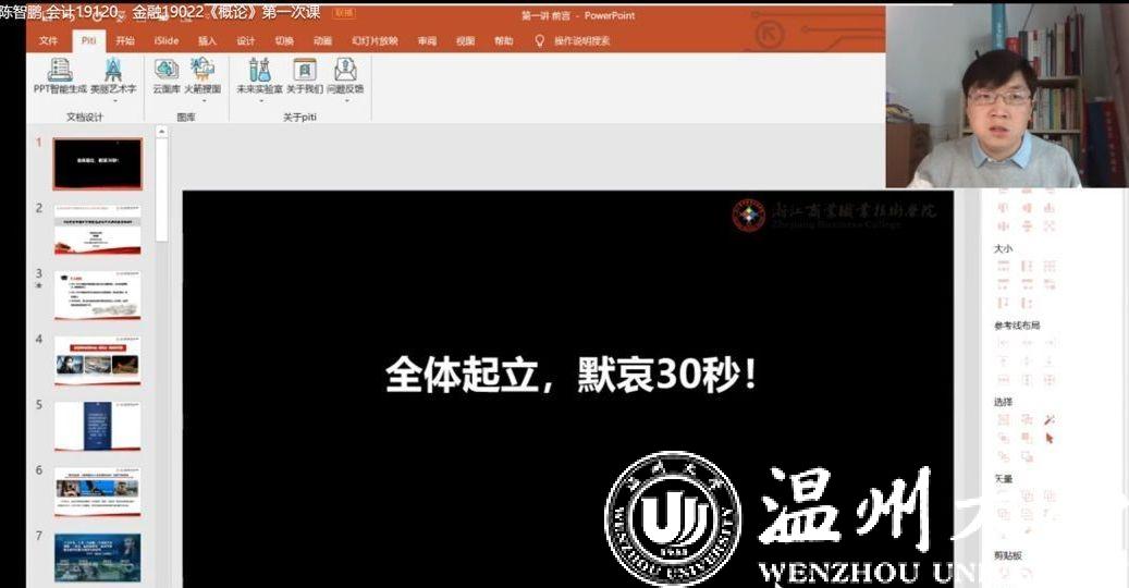 十大体育博彩排行榜 充分利用线上教学平台、现代教学技术和优质在线课程资源,全面启动新学期线上教学与管理工作。本学期共有思政课涉及全校16个十大体育博彩排行榜 的104个教学班。温大思政课全面开启“三全”线上教学:战“疫”在线“主播”思政全覆盖、战“疫”专题思政第一课全新讲、战“疫”在线思政课程全共享。