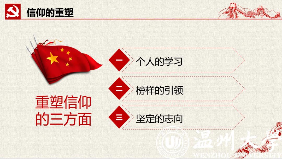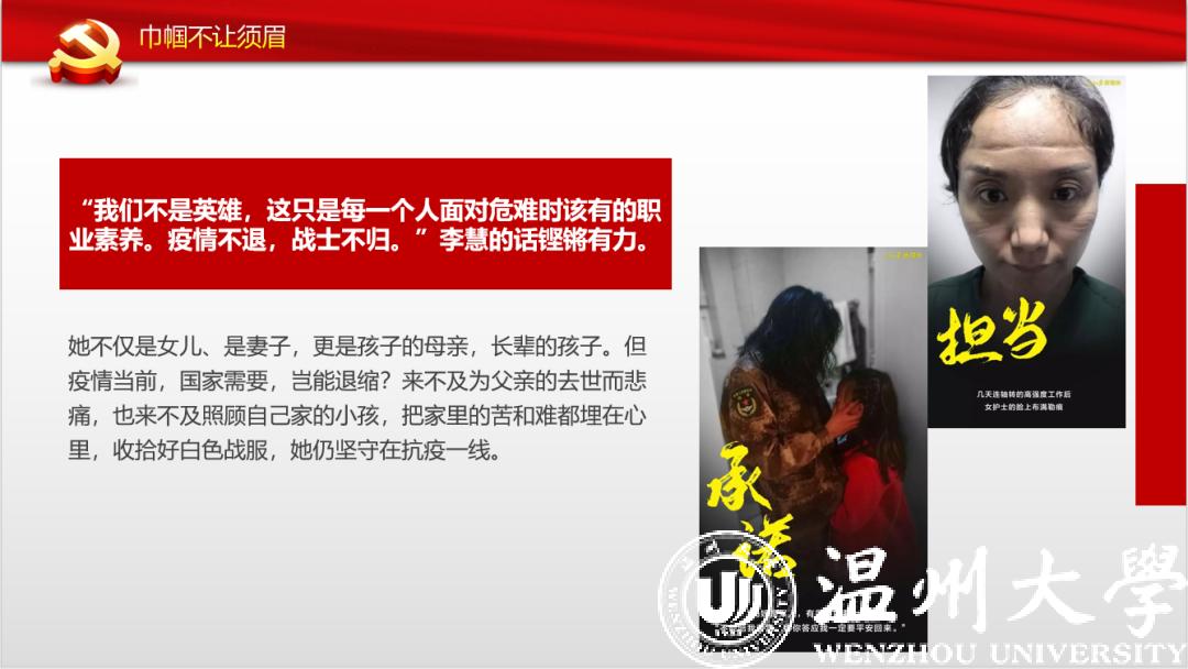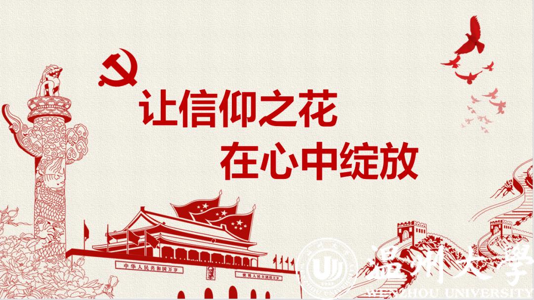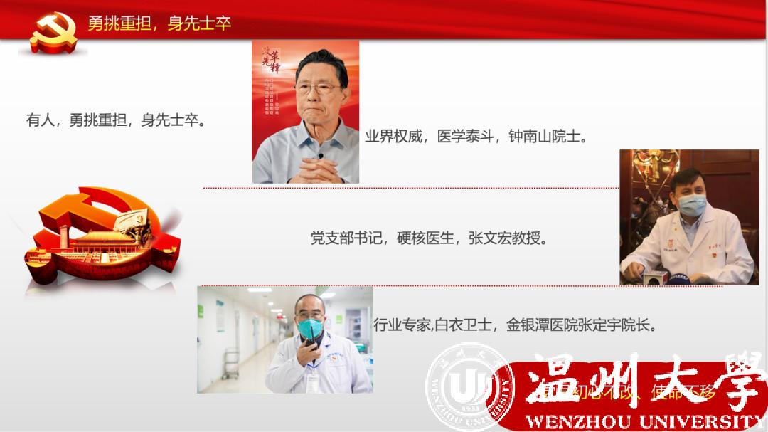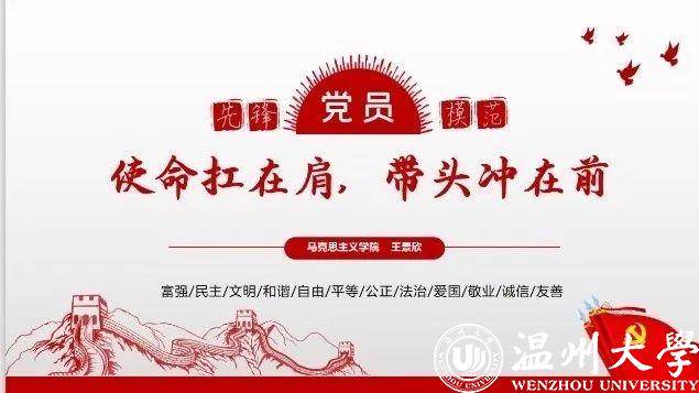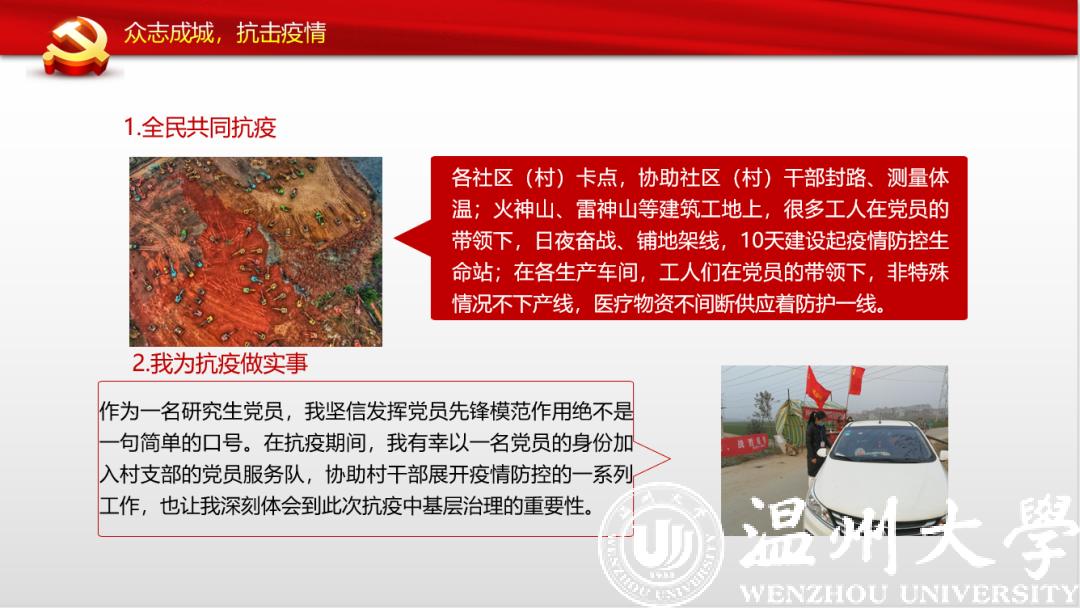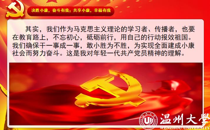 来自本科生党支部的入党积极分子许媛媛从一位老支书讲起,分享了他在全面建成小康之路上的艰辛付出,讲述了共产党员的责任担当。在此基础上,他看到了一批批抗疫先锋在抗疫阻击战中的身影,尤其是一个个温大人的力量,彰显着“求学问是、敢为人先”的温大精神。