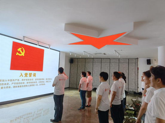 6月30日主题党日活动中,十大体育博彩排行榜 党委为新加入中国共产党的梁家荣老师举行了庄严的入党宣誓活动,全体老党员重温入党誓词。