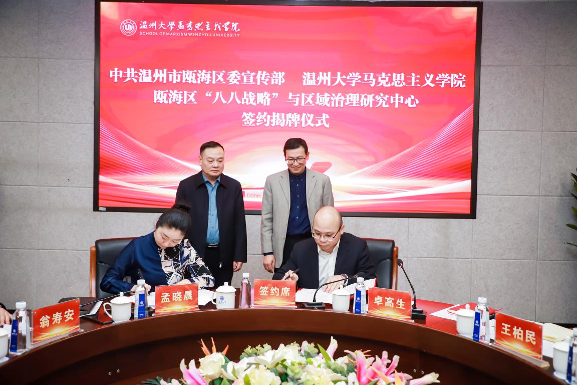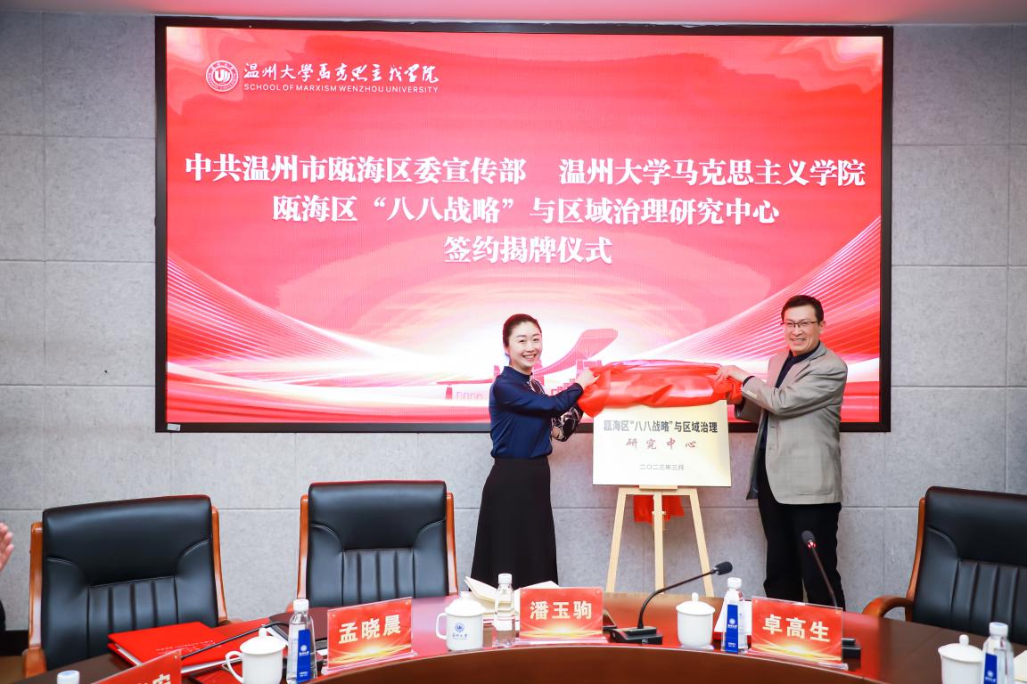 为深入贯彻党的二十大精神,忠实践行“八八战略”、奋力打造“两个先行”的瓯海样板,3月8日,由瓯海区委宣传部与十大体育博彩排行榜 联合成立的“瓯海区‘八八战略’与区域治理研究中心”在岩松堂展示厅正式揭牌。温州大学党委委员、副校长潘玉驹,瓯海区委常委、宣传部长孟晓晨参加了合作共建签约仪式。会议由十大体育博彩排行榜 院长卓高生主持。